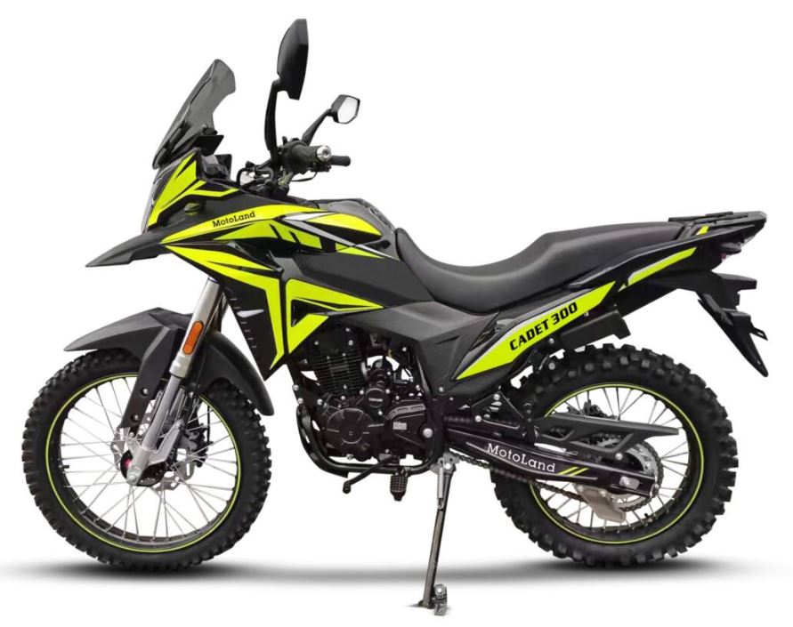 Мотоцикл Motoland 300 ENDURO CADET характеризуется своим ярким и узнаваемым дизайном, прочной рамой из Cro-mo труб, обладающей высокими прочностными характеристиками, а также современной подвеской с выносными регулировками компрессии и отскока. Он оснащен ободами из  алюминиевого сплава, наличием электростартера, прямоточным